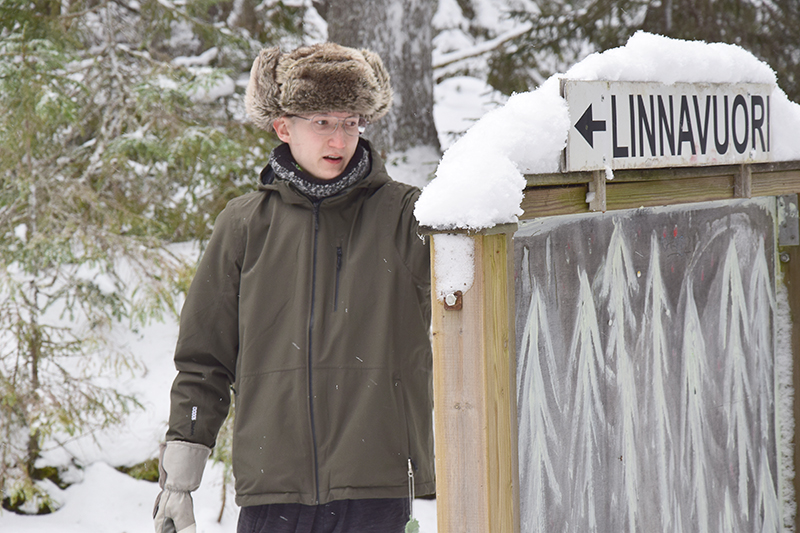 – Täällä me olemme käyneet Sarilla syömässä, kävimme Padasjoella hakkuutyömaalla, kun isällä (Petri Liehu) on siellä juuri hakkuutyömaa menossa. Yötä olimme Lehdesmäessä, saunoimme, istuimme kodassa, paistoimme makkaraa ja tutustuimme toisiimme. Aamulla kävimme omilla katsomassa ojitettua turvemaata ja sitten tulimme tänne Linnavuoreen, Liehu kertoo.