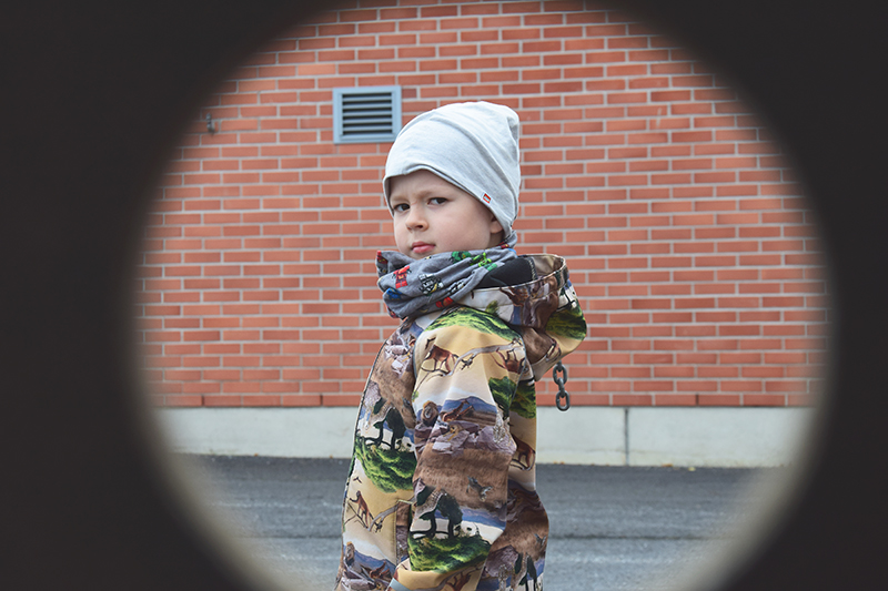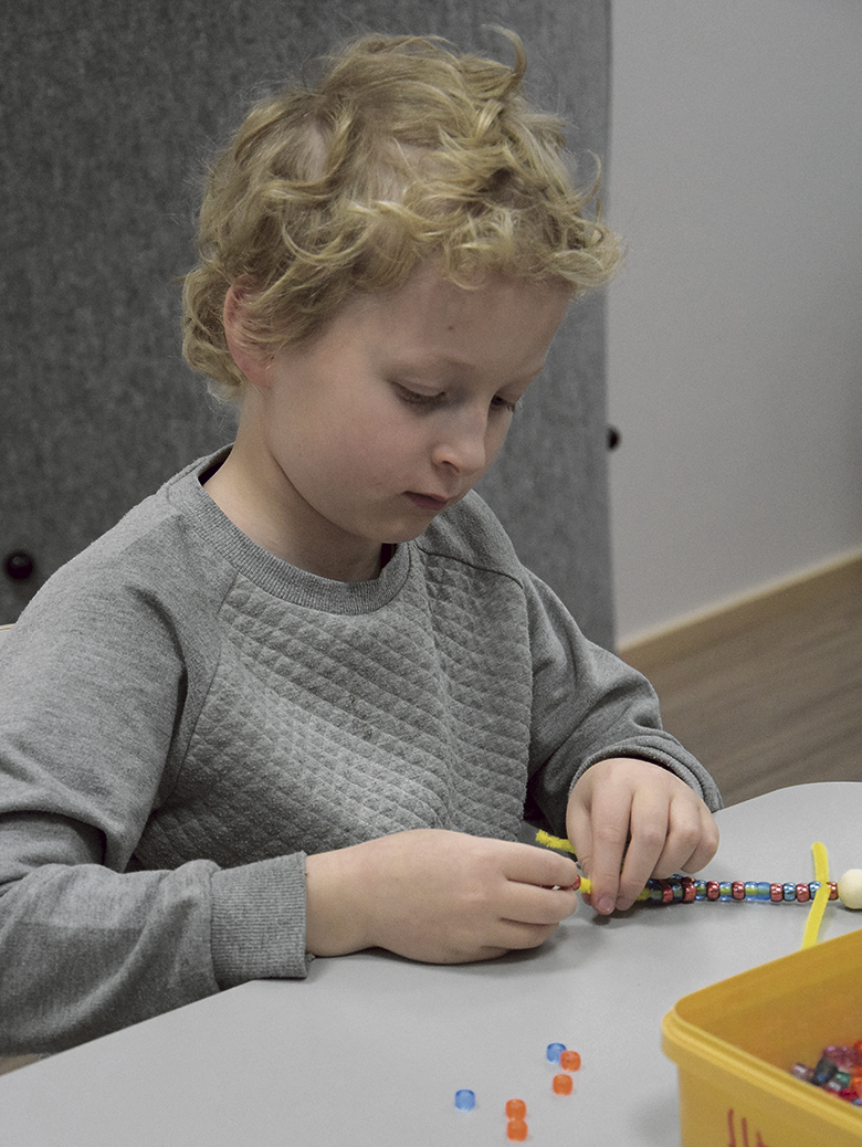 Elmo Unkari askartelee keskittyneesti pientä hahmoa sateenkaaren kirjavista helmistä. Seitsemänvuotias syyslomalainen on jo ehtinyt pyörittää onnenpyörää ja tehdä tasapainoilurataa pallolla.