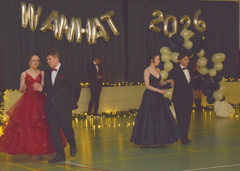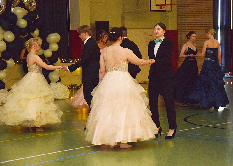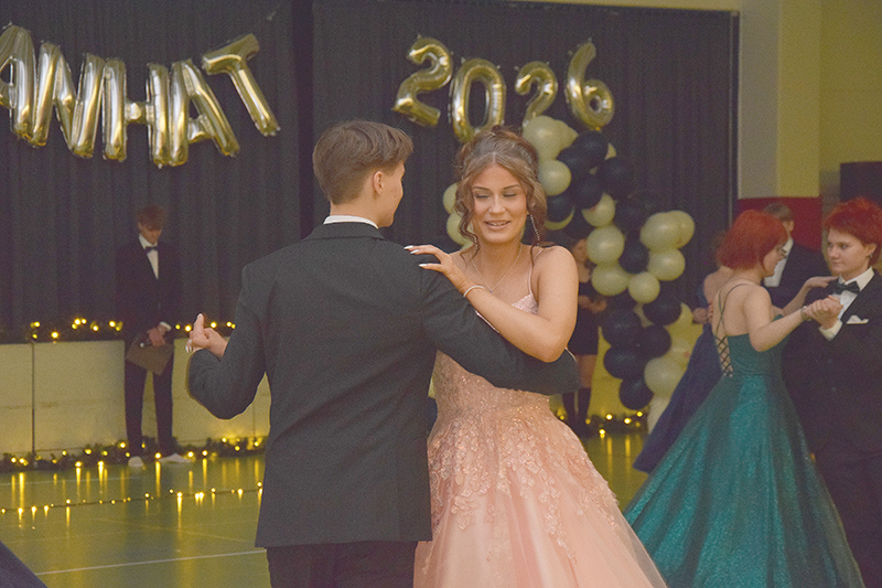 ”Wanhuus ei ole koskaan näyttänyt näin hyvältä”, totesivat vuoden 2026 wanhojen tansseja juontaneet Hilma Järvinen ja Elias Helin avatessaan wanhojen tanssiurakan perjantaiaamuna yhtenäiskoululla.