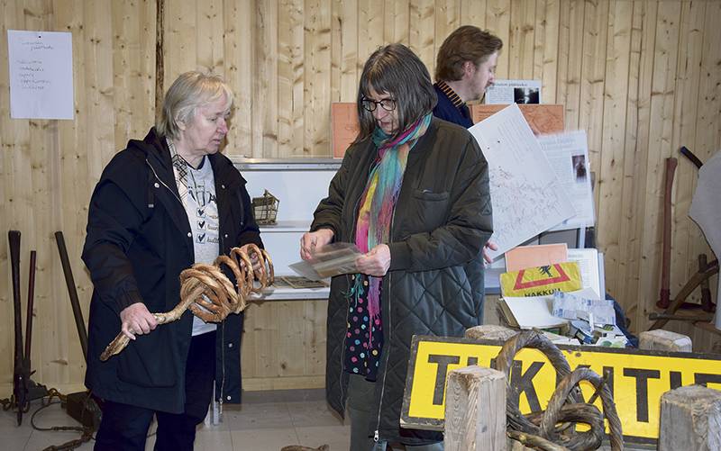 Päijälän seudun kyläyhdistyksen puheenjohtaja Leena Bragge sekä Ulla Lahtinen tutkivat kylään nousevan tukkilaistuvan esineistöä. Tukkilaistupa on osa Elinvoimainen Päijälä -hanketta ja kylän vetonaula.