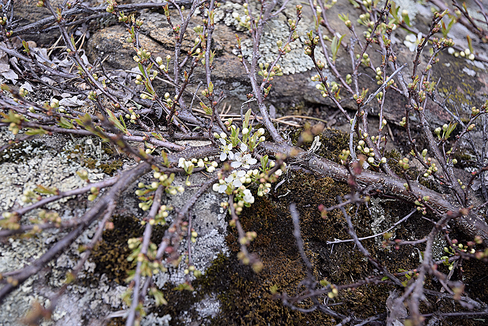 Lamohietakirsikka tekee jo kukkaa. Kallioinen rinne on sille hyvä kasvupaikka.