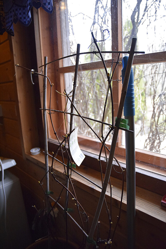 Somerset seedless -viiniköynnös on talvehtinut puusaunan pesutilassa ja odottaa jo ulkoilmaan pääsyä.