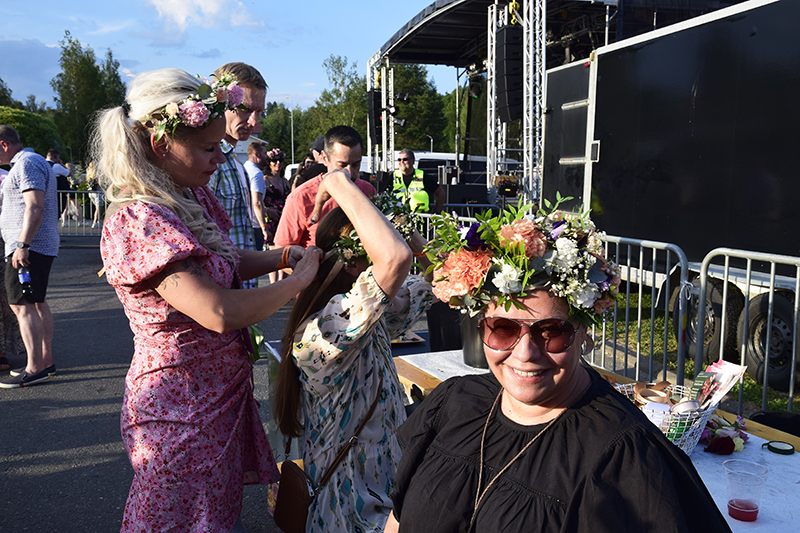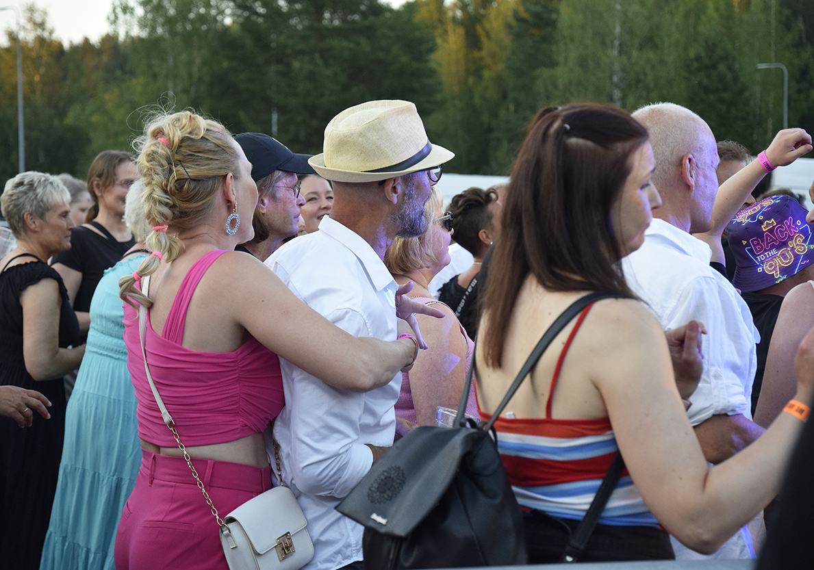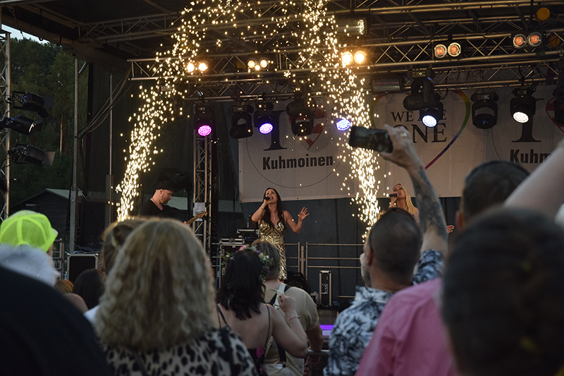 Festarit polkaisi käyntiin Poju, jonka tunnetuimpia kappaleita on Esson baariin.Poika pääsi kuin pääsikin saunomaan – paidatta, kuten asiaan kuuluu.Yleisö löysi eturiviin heti illan ensimmäisen artistin aikana.Mari Riikonen sitoi kukkaseppelettä Selena Pesosen hiuksiin. Edessä istuva Heli Nordenstedt oli jo omansa saanut. – Tulimme tänne Vantaalta viettämään kesäpäivää. Illan artistit ovat tuttuja omasta nuoruudesta, Nordenstedt kertoi.2. Maanantai teki tänä kesänä paluun festarilavoille seitsemän vuoden tauon jälkeen. Yhtyeen tunnetuin hitti on Mixet tahdo olla munkaa, joka oli vuoden 1994 myydyin kotimainen single.2. Maanantai -yhtyeen keulahahmo on Petri Flander, joka tunnetaan taiteilijanimellä Peter Bottne.Sari Paronen myi festareiden teemaan sopivia asusteita. Yleisössä näkyikin paljon isoja koruja ja näyttäviä hiuskoristeita.Euroviisu-faneja hemmoteltiin CatCatin tahtiin. Yhtye esiintyi viisuissa vuonna 1994 kappaleellaan Bye bye baby.Suosikkiartistien esiintymisiä tallennettiin ahkerasti.Omien hittiensä lisäksi CatCat lauloi muun muassa Menneisyyden vankien hittikappaleen Kaksi lensi yli käenpesän.CatCat-duon muodostavat siskokset Katja ja Virpi Kätkä.Yleisöllä ja artisteilla oli mahdollisuus maalauttaa itselleen näyttävät glitter-maalaukset.Päijäthämäläiset teatterialan ammattilaiset ilahduttivat festariyleisöä keppihevosilla esittämällään performanssilla.Festareiden äiti Sakke Wallenius (oikealla) ehti kesken kiireiden myös itse esiintymään. Mascara esitti vanhojen hittiensä lisäksi uutta tuotantoa – muun muassa kappaleet Kuuma kesäyö ja Partyopoika.Tunnelma festareilla oli lämminhenkinen. Ilta oli täynnä iloa, riemua ja yhteisöllisyytttä.Pikkuhousukeisari Frederik täytti helmikuussa 80, mutta ikä ei menoa haittaa. Linda, Kolmekymppinen, Tsingis Khan ja monet muut hitit taittuivat kaiken ikäisiltä katsojilta.Yleisön hauskanpito ei jäänyt vain esiintymislavan eturiviin vaan levisi koko festarialueelle.Ysärimusiikki yhdistää eri sukupolvia.Illan päätti eurodancen kuningatar Pandora.Pandoran kanssa lavalla nähtiin myös hänen puolisonsa Mikko Peltonen.Ilta hämärtyi ja helle hellitti, mutta tunnelma festarialueella oli lämmin.Osalle yleisöstä We are one -festarit olivat rakkauden täyteiset, kuten järjestäjät etukäteen toivoivatkin.